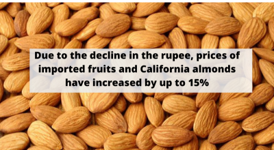 Due to the rupee's devaluation, the prices of Californian almonds, Washington apples, imported cherries, kiwis, and berries have increased by up to 15%, harming the increase in home demand that followed the second wave of Covid-19.